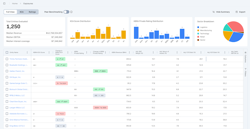 Compare leverage, coverage, and liquidity metrics for your private credit exposures against middle-market borrowers—segmented by size and sector—using audited, normalized KBRA data. Built on borrower-level financials that are otherwise private and not available through public filings or sponsor marketing materials.